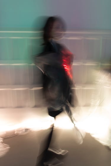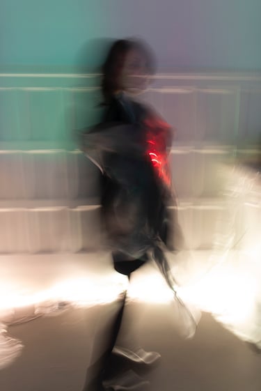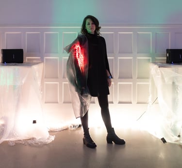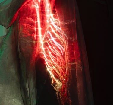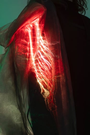 The work combines responsive fabrics embedded with light that react to the wearer’s movements, creating a dynamic, living surface that responds in real time. Sound, derived from electromagnetic field recordings made in the MAIN labs, extends the experience into the sonic dimension, transforming scientific data into spatial audio that interacts with the surrounding environment. This blend of light, sound, and movement creates a living interface where the body becomes a conduit for energetic and informational exchanges between the physical and digital realms.